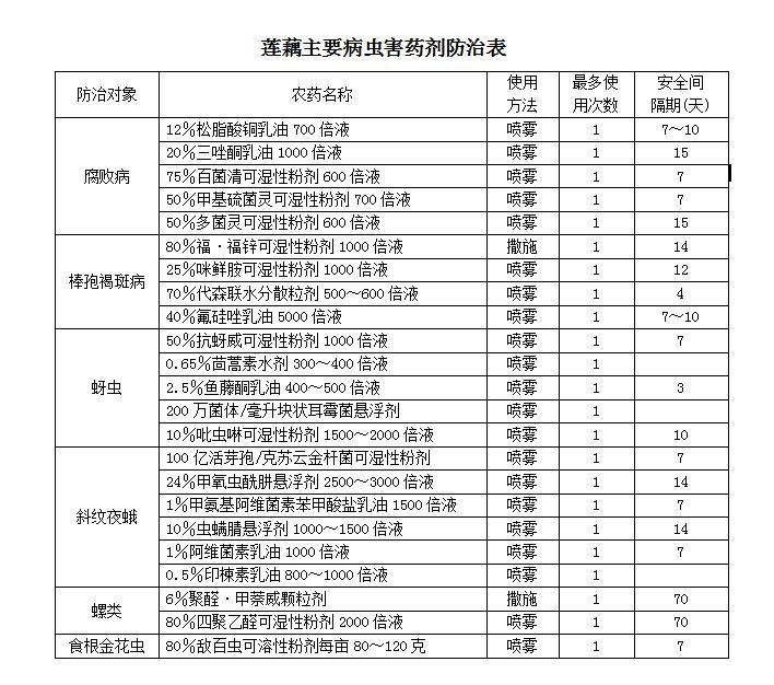 采取综合防治措施,加强农业防治、物理防治和生物防治。如栽植无病种藕,清洁田园,加强除草,减少病虫源;每亩施用茶枯饼40~50千克可防治稻根叶甲;人工摘除斜纹夜蛾卵块或于幼虫未分散前集中捕杀;用杀虫灯(黑光灯或频振式杀虫灯)或糖醋液诱杀成虫;田间设置黄板诱杀有翅蚜;人工捕杀克氏螯虾和福寿螺。田间放养黄鳝和泥鳅防治稻根叶甲;每亩用1.6万单位/毫克苏云金杆菌(Bt)可湿性粉剂50~75克对水55千克喷雾,可防治斜纹夜蛾等。