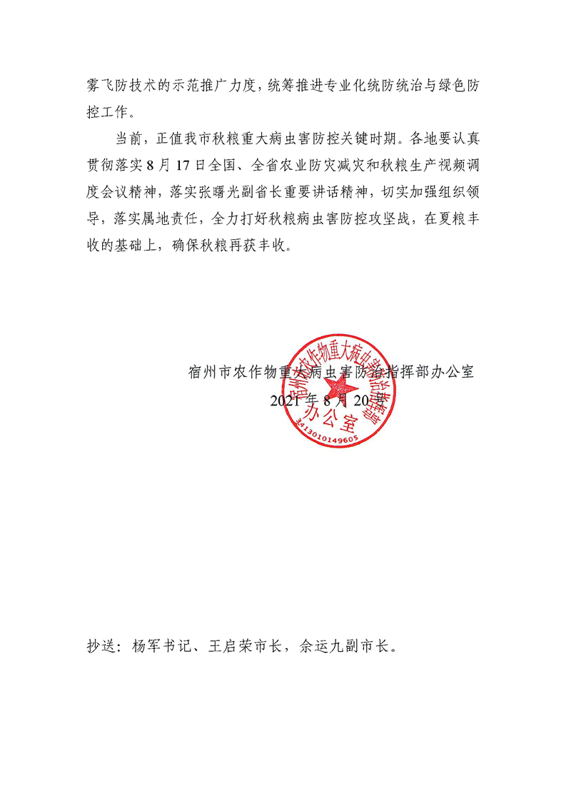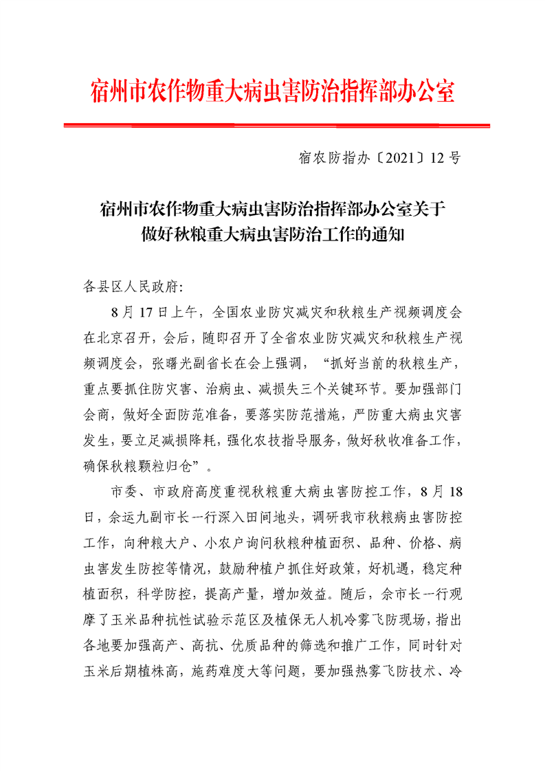 宿州市农作物重大病虫害防治指挥部办公室关于做好秋粮重大病虫害防治工作的通知