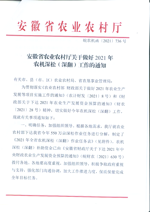 附件:安徽省农业农村厅关于做好2021年农机深松(深翻)工作的通知
