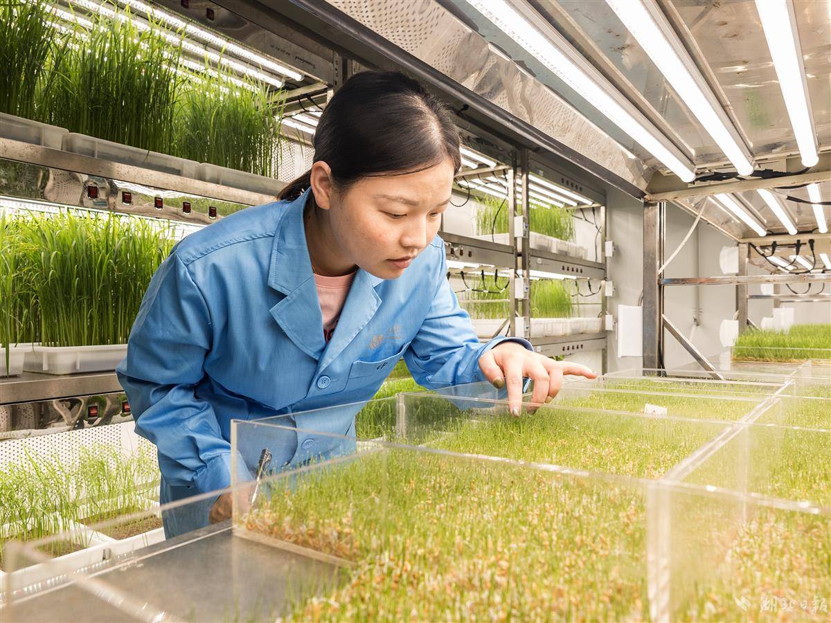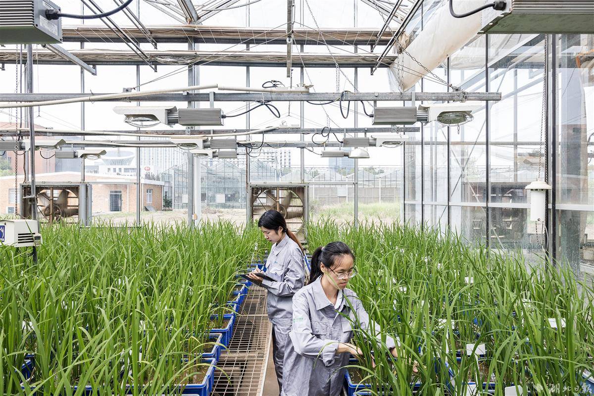 8月23日,在武汉国家农创中心核心功能区的中国种子生命科学技术中心(简称“中种科技中心”),温室科学家姬晨晨和同事朱红梅在室内培养室内观察水稻秧苗生长情况。近年来,由在汉央企中种科技中心选育研发的优质稻品种“荃优607”在长江中下游稻区广泛种植,上市3年来累计推广超400万亩,以其耐高温低温、抗伏倒、米质好等全能优势,受到广大种植户的欢迎。