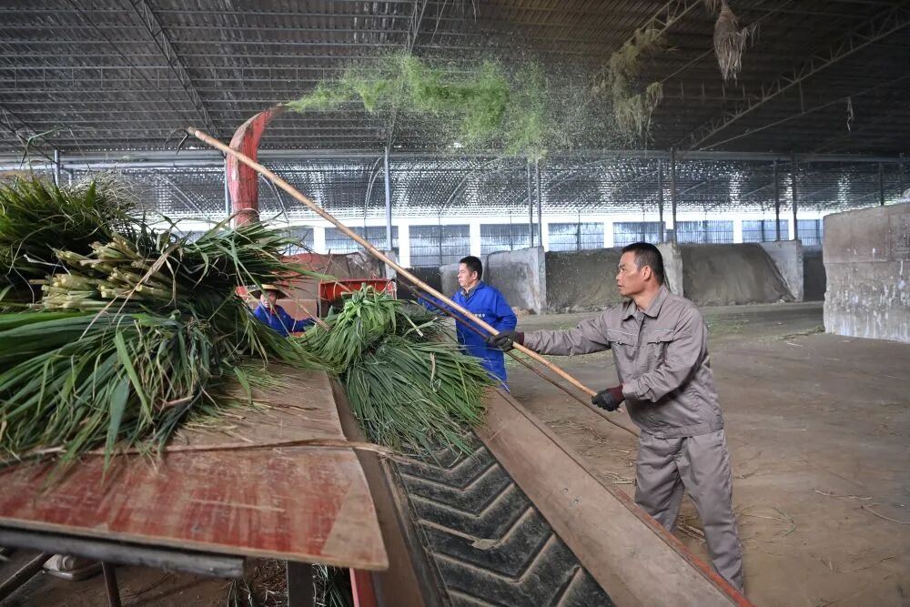 近日,在广西来宾市一家养牛场,工作人员正将甘蔗尾梢加工成饲料。新华社记者 周华 摄