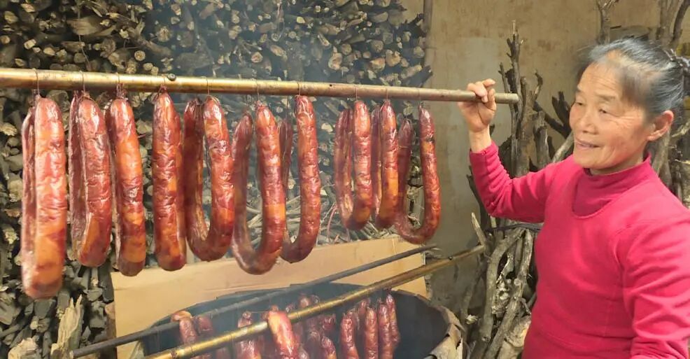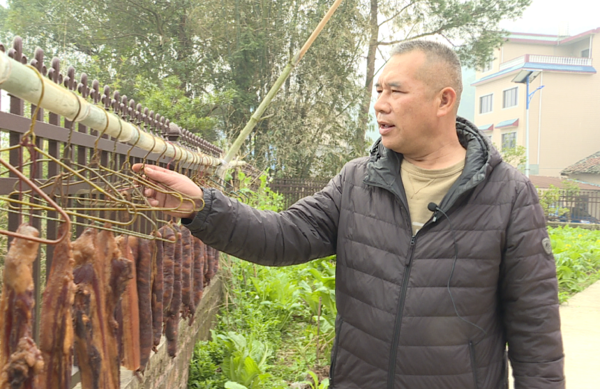 俗话说得好,“过年没腊味,年就少了味”。随着春节的脚步越来越近,腊味成了永福老百姓饭桌上必不可少的美味佳肴。很多家庭都在房前屋后挂上了自家熏制的各种腊味,微风拂过,走村串户的腊味香气扑面而来。 陶林是永福镇渔洞村的村民,在广东经商的他,公司一放假就回村协助妈妈熏制今年的腊肉。 永福镇渔洞村村民陶林:“因为我干这个行业放假比较早,每年都回家做腊肉。在十二、十三号的时候就把猪杀好了,腌制几天就能开始熏制。” 每年冬至节气的前后几天,陶林的母亲都会停下手中的农活,集中精力制作腊味。陶妈妈向记者介绍说,她家的腊味都是用糖蔗熏制的,这样熏制出来的腊味色泽金黄,吃着还会有一股果香的回味。今年,陶林要陪同江西的妻子回娘家过年,陶妈妈精心制作的这些腊味就是他准备的主要礼物。 永福镇渔洞村村民陶林:“我老婆娘家比较远,在江西那边。今年回江西过年,刚好小姨子结婚,所以带一些腊肉回去。她那边腊肉是风干的,我们这边还要熏制,一定要熏制好了腊肉才有那种金黄的色泽,才有桂林腊肉的风味。” “现在买猪肉方便,今年腊了五十六斤腊肉,做了腊肉才有过年的感觉。”唐庆华是陶林家的邻居,腊味也是他家年饭桌上必备的菜肴。 除了腊肉、腊肠,像猪脚、鸡、鸭、鱼等食材也是永福人春节的必腊品。永福的年味就是从灌香肠、熏腊味开始的,这年味即是一种年俗文化的传承,更是在外漂泊游子们割舍不了的乡愁。